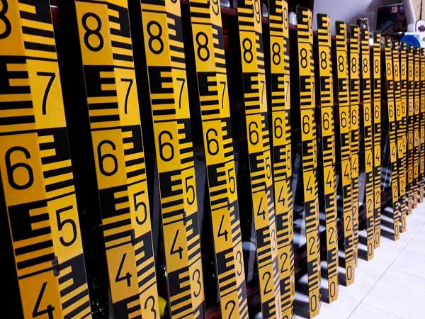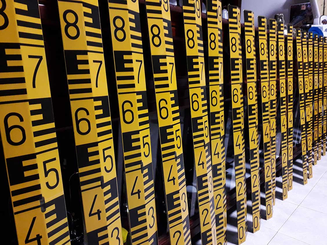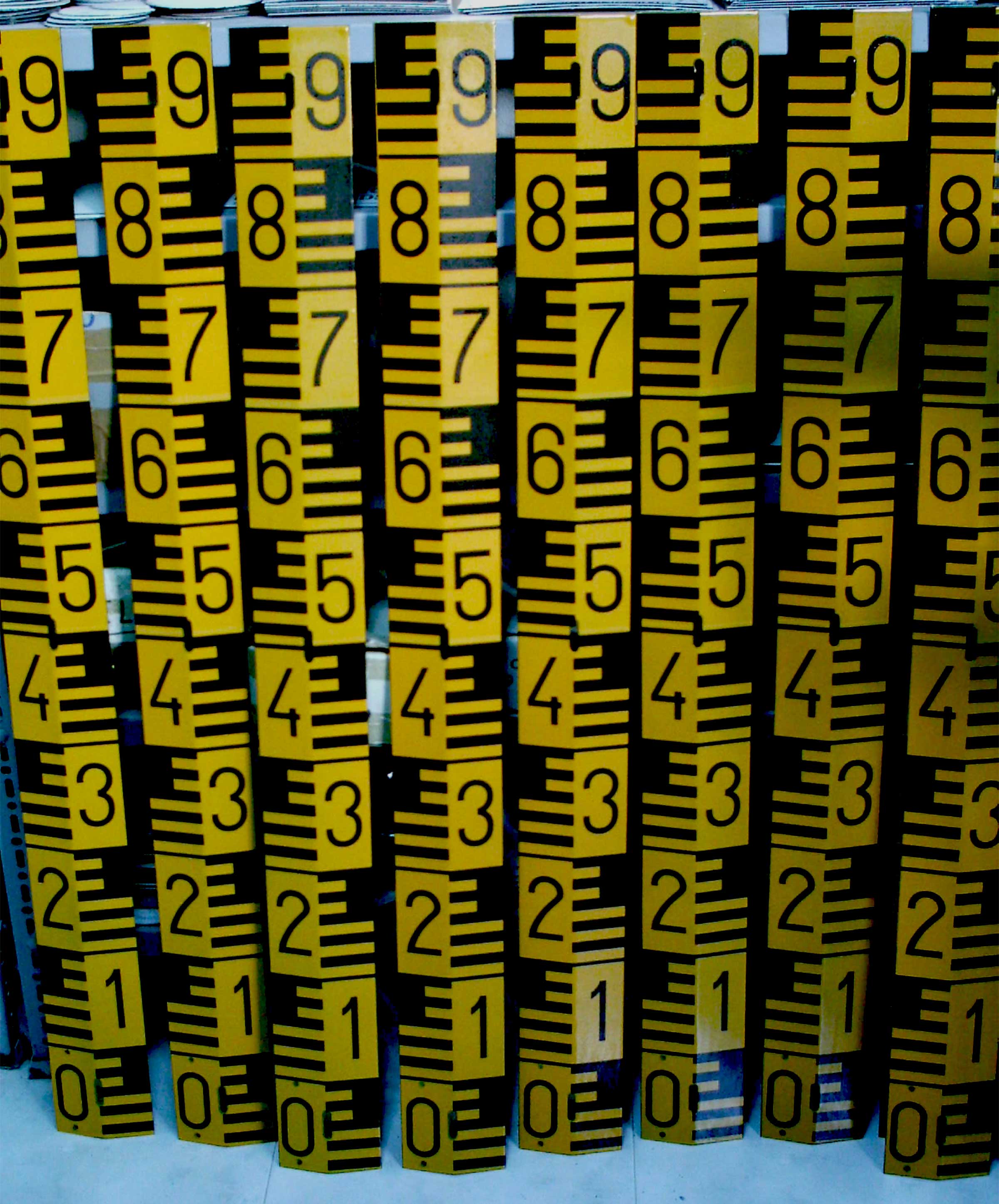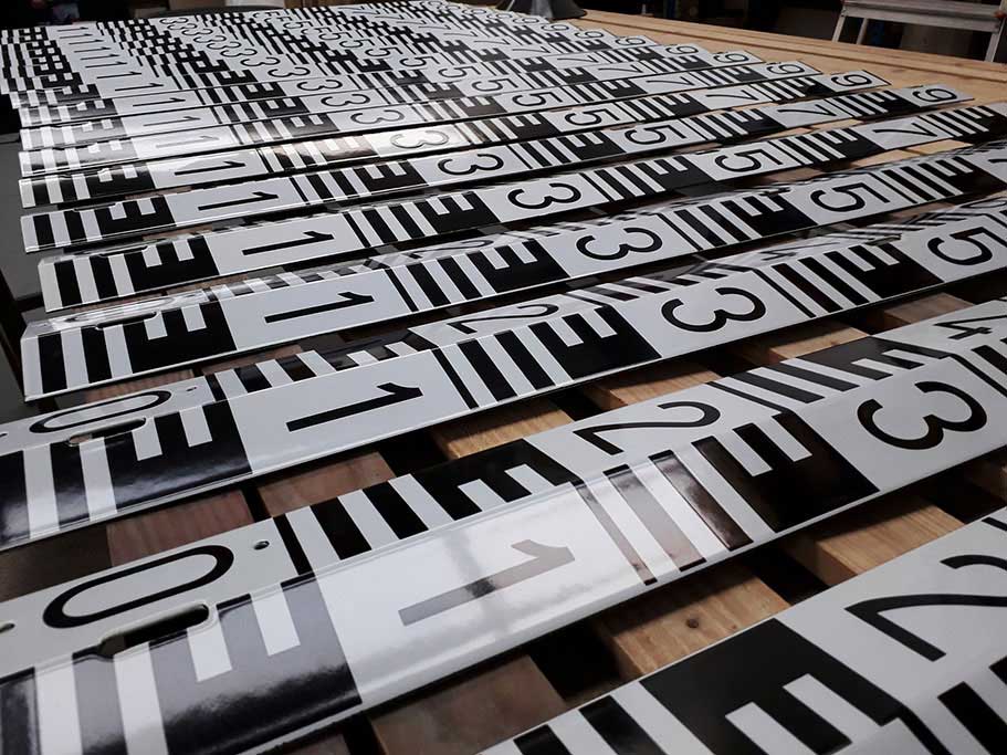 Fabricamos escalas em chapa de aço quinada, revestida a esmalte vitrificado a 800ºC com espessura 1,5mm. Cores: Branco com escala a preto e Amarelo com escala a preto Medida: 10x100 cm