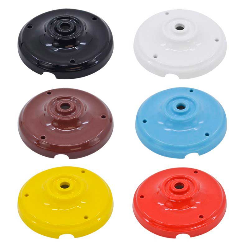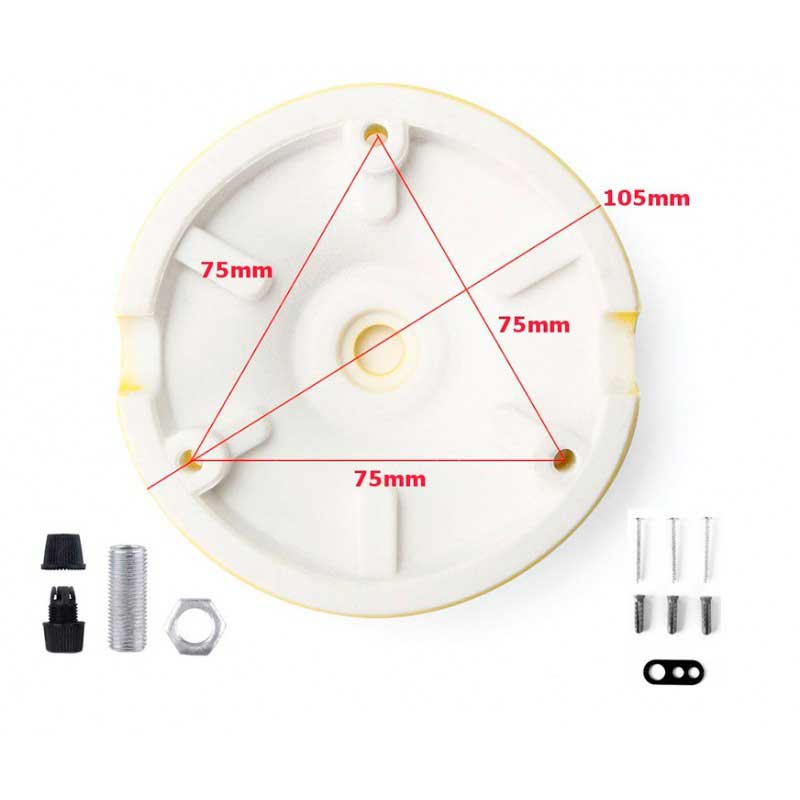 Tem um furo para a saída do fio, dois furos laterais para ter a possibilidade de ligar com outros florões e três espaços para fixar ao teto com três parafusos.